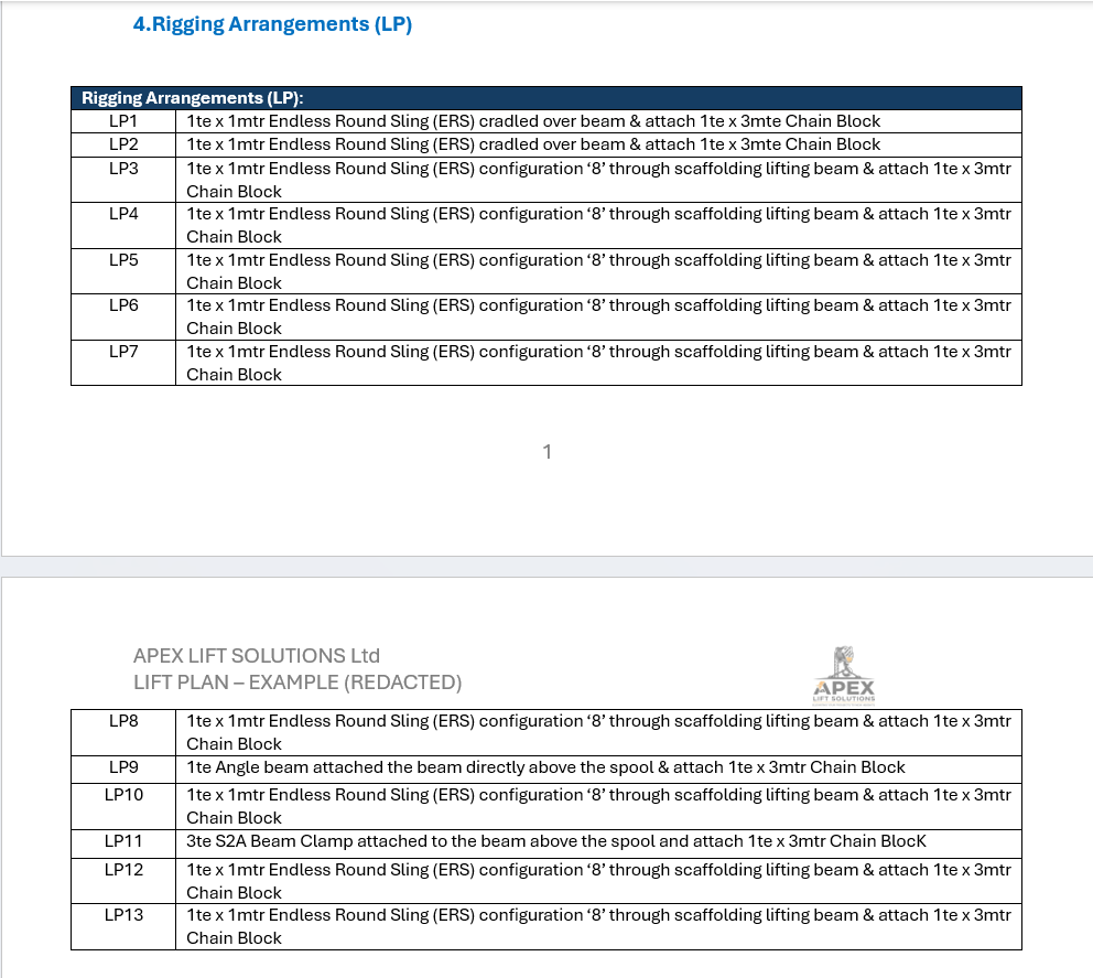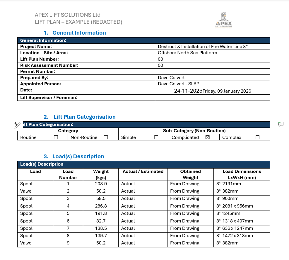Redacted example showing lift scope, load identification, weights, dimentions, and lift catagorisation in accordance with UK lifting standards.