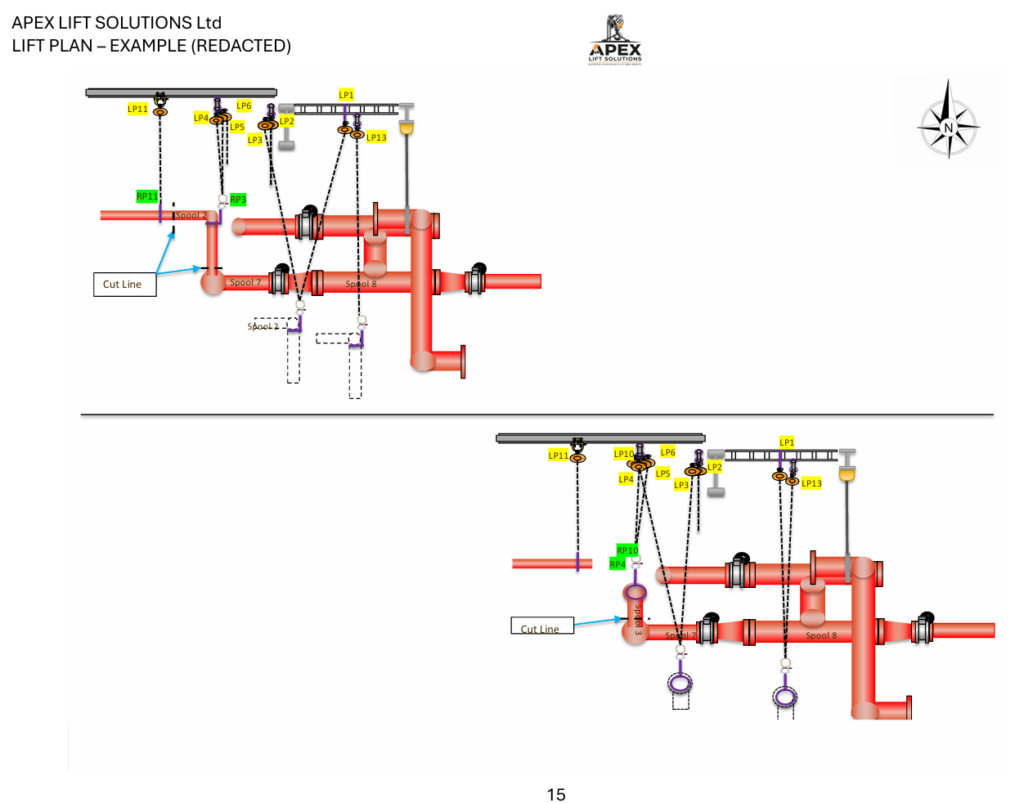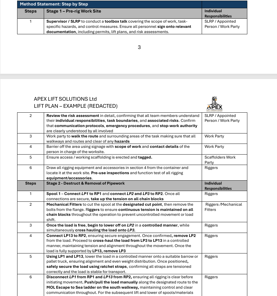 The example demonstrates our approach to lift planning, method statements, and risk assessments for complicated lifting operations within offshore and industrial environments.
