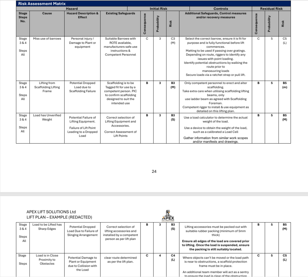 Redacted example risk assessment indetifying task-specific hazards, control measures, and resdiual risk levels for a non-routine lifting operation.